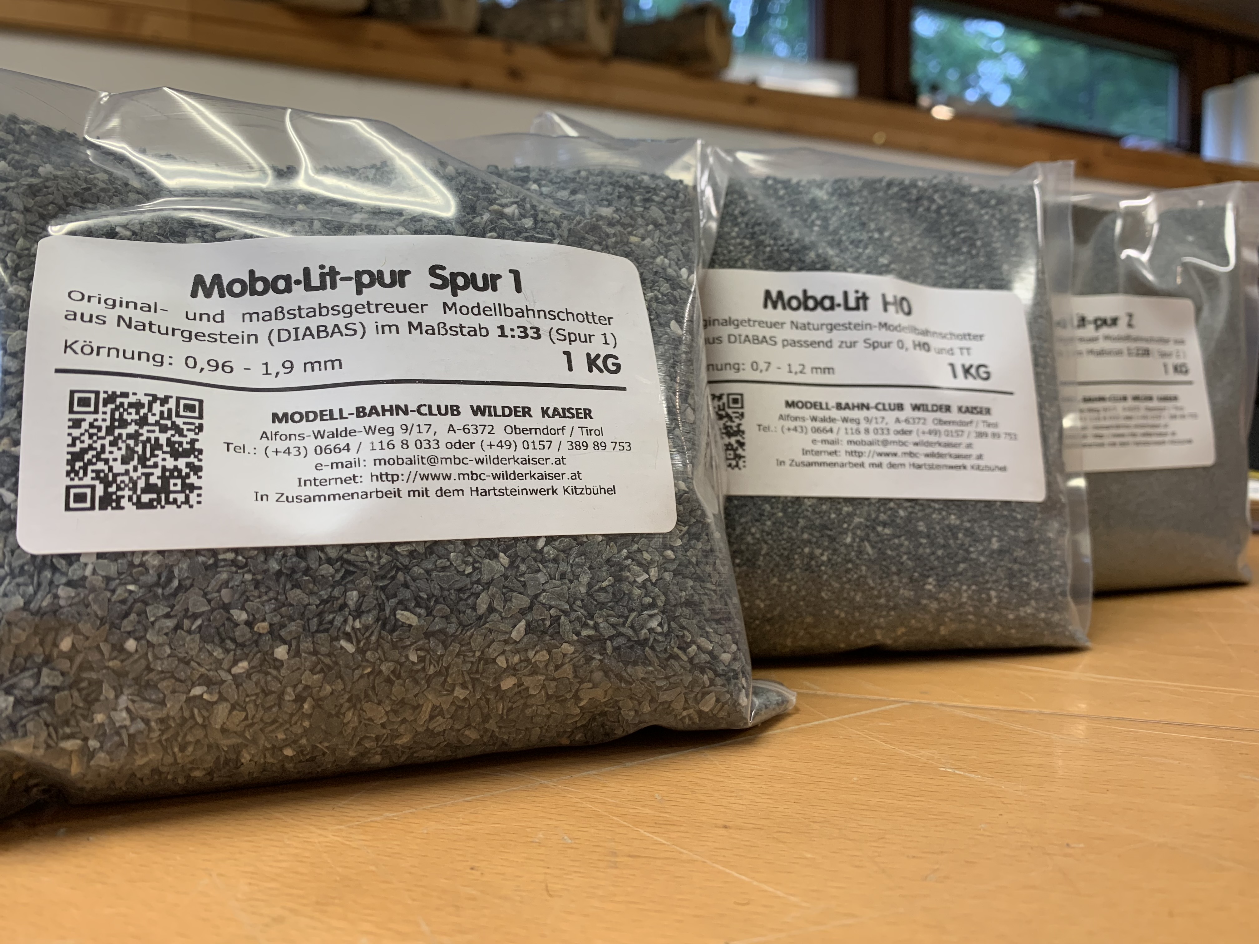 Unser Verein ist auf dem Gelände des Hartsteinwerks Kitzbühel eingemietet, wo regelmäßig Gleisschotter für die ÖBB produziert wird. Wir bieten diesen Naturgesteinsschotter – natürlich in den maßstäblich richtigen Korngrößen – unseren Modelleisenbahnkollegen in ganz Europa an. Er ist für alle gängigen Spurweiten in Verpackungen zu ein und sechs Kilogramm erhältlich und ein Highlight jeder Modelleisenbahnanlage.